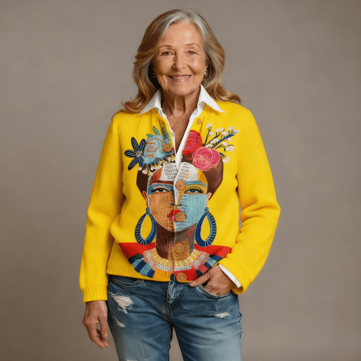 The Anna Cardigan is more than just a cozy layer — it’s a statement piece. Featuring a stunning art-inspired portrait with vibrant colors and hand-painted floral details, this cardigan brings creativity and warmth together in the most elegant way.